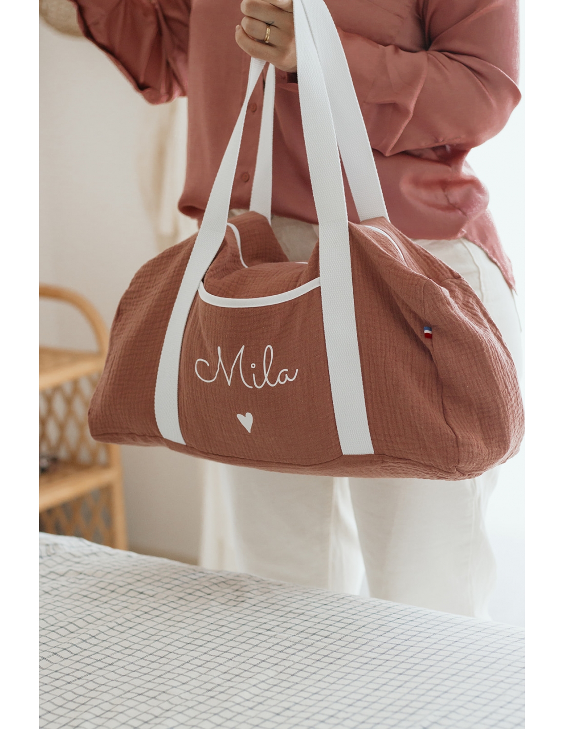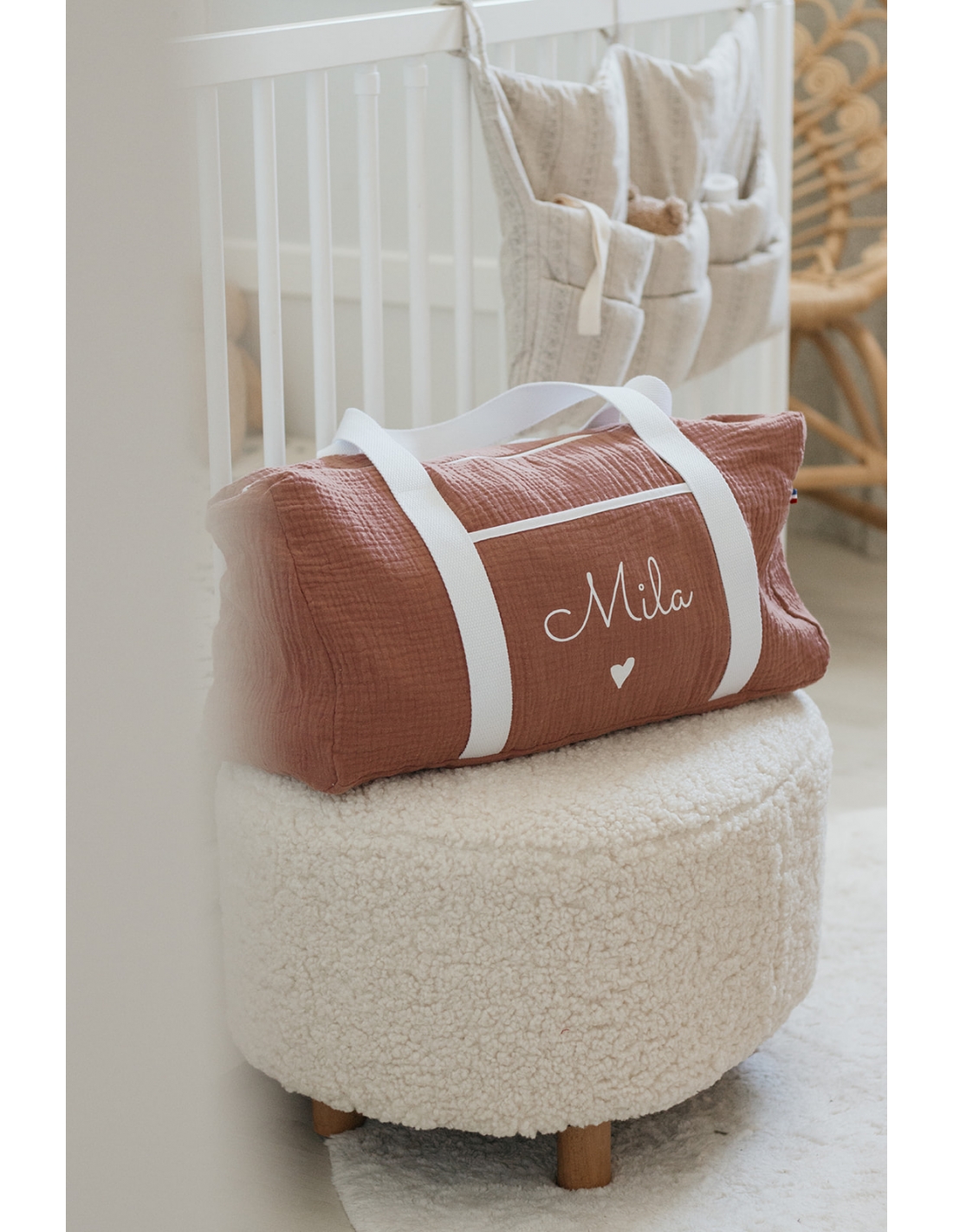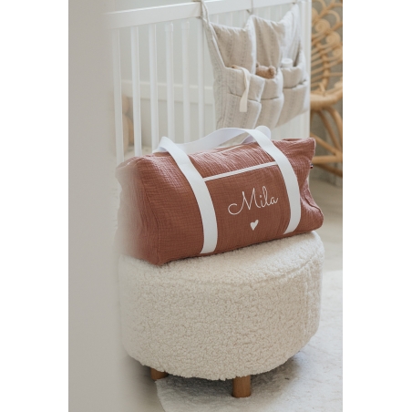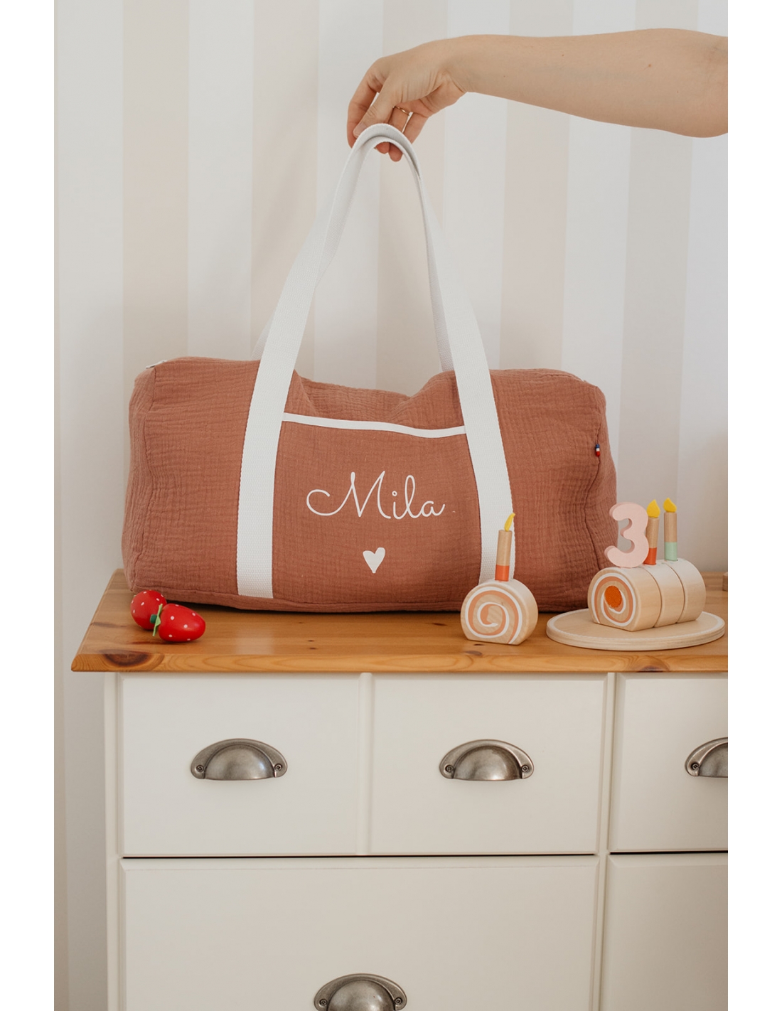 Sac week-end personnalisable en gaze de coton vieux rose petit coeur