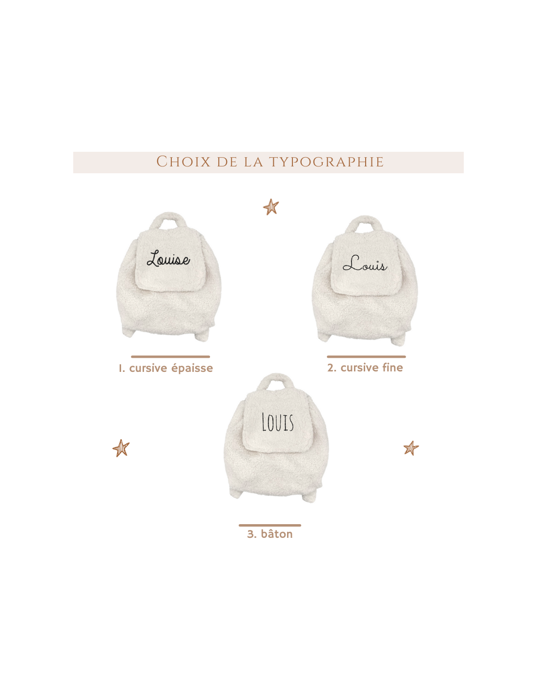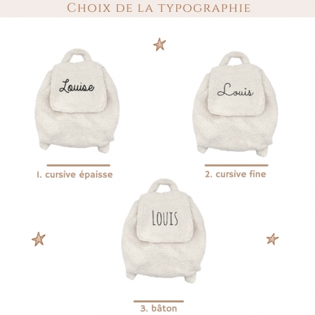Un très joli sac à dos personnalisable dans lequel on peut transporter un goûter, des affaires de rechange, une tétine ou un doudou.